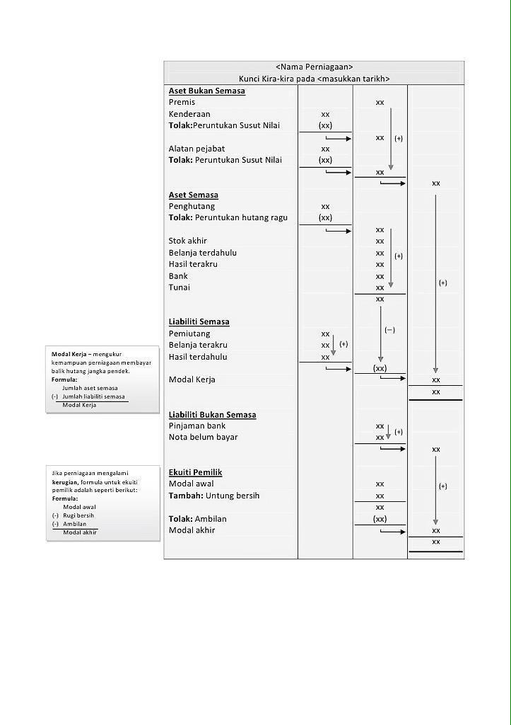 Kunci kira kira xls kunci kira kira perniagaan fashion nista sdn bhd kunci kira kira pada 31 oktober 2013 rm aset bukan semasa perabot kenderaan rm rm course hero English exit test uitm writing examples; Jika diberikan imbangan duga, lihat kepada item sebelah debit, selain daripada akaun aset dan akaun kontra. Kunci kira kira in english. Balance sheet about s left trial balance kunci kirakira. Aset liabiliti ekuiti pemilik hasil dan belanja waktu solat dot net. Jadual gaji n22 2017 jadual pinjaman peribadi bsn 2018 kakitangan kerajaan jadual kadar harga jkr 2017 jadual pembayaran perkeso 2018 jadual kadar harga kerja pembersihan jadual pelupusan rekod urusan am jpr am 2012 arkib negara malaysia jadual gaji kakitangan awam mengikut gred 2020 jadual pembayaran pinjaman. Contextual translation of kunci kira kira format into english. Contextual translation of penyata kunci kira kira bentuk t into english. Kunci kira kira penyata xls contoh format kunci kira kira dalam bentuk penyata penyata pendapatan bagi tahun berakhir 31 disember 2007 rm rm aset course hero Tips untuk mengingat kkk, kepada sifu adalah seperti berikut: Ianya adalah snapshot keadaan kewangan bisnes, memberikan idea tentang apa yang dipunyai oleh syarikat, apa yang syarikat sedang pinjam (owns and owes), dan jumlah yang dilaburkan oleh pemegang saham syarikat. Contextual translation of kunci kira kira format into english.