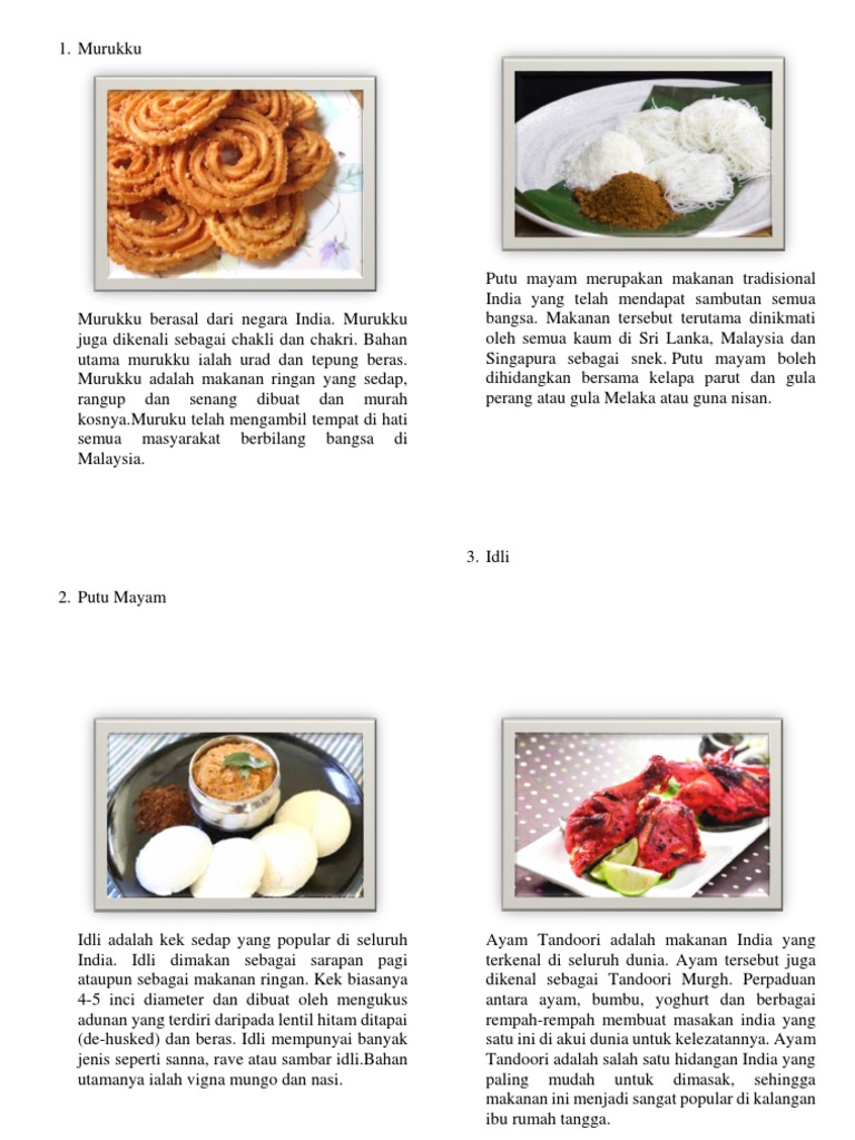 Rakyat united kingdom merujuk murukku sebagai chakri di negara tersebut. Kaum india lebih dominan kepada roti canai atau pratha. Pelbagai jenis makanan lazat sama ada tradisional, timur atau barat semuanya boleh jumlah kaum terbesar di malaysia adalah kaum melayu, cina dan india dan setiap kaum di malaysia ini mempunyai makanan tradisional mereka sendiri. Oleh itu memang benarlah kata perdana menteri kita di malaysia,masyarakat india juga mempunyai makanan tradisional tersendiri. Makanan di malaysia melambangkan rakyatnya yang berbilang kaum iatu melayu,cina dan india. Penduduk melayu, cina dan pelbagai kaum etnik yang lain telah hidup bersama sejak beberapa generasi yang lalu. Makanan tradisional sangat popular dalam kalangan masyarakat kita di malaysia yang kaya dengan pelbagai adat dan budaya. Makanan tradisi kaum india seperti kaum cina, kaum india juga mempunyai budaya makanan yang tersendiri. Char kway teow yang paling terkenal di malaysia ialah penang char kway teow. Ini kerana keunikan masakan tradisional india yang banyak menggunakan rempah ratus. Makanan tradisional di malaysiapenduduk melayu, cina dan pelbagai kaum etnik yang lain telah hidup bersama sejak beberapa generasi yang lalu. Malaysia yang terdiri daripada pelbagai bangsa dan budaya. Makanan tradisional terbahagi kepada makanan basah dan makanan kering.