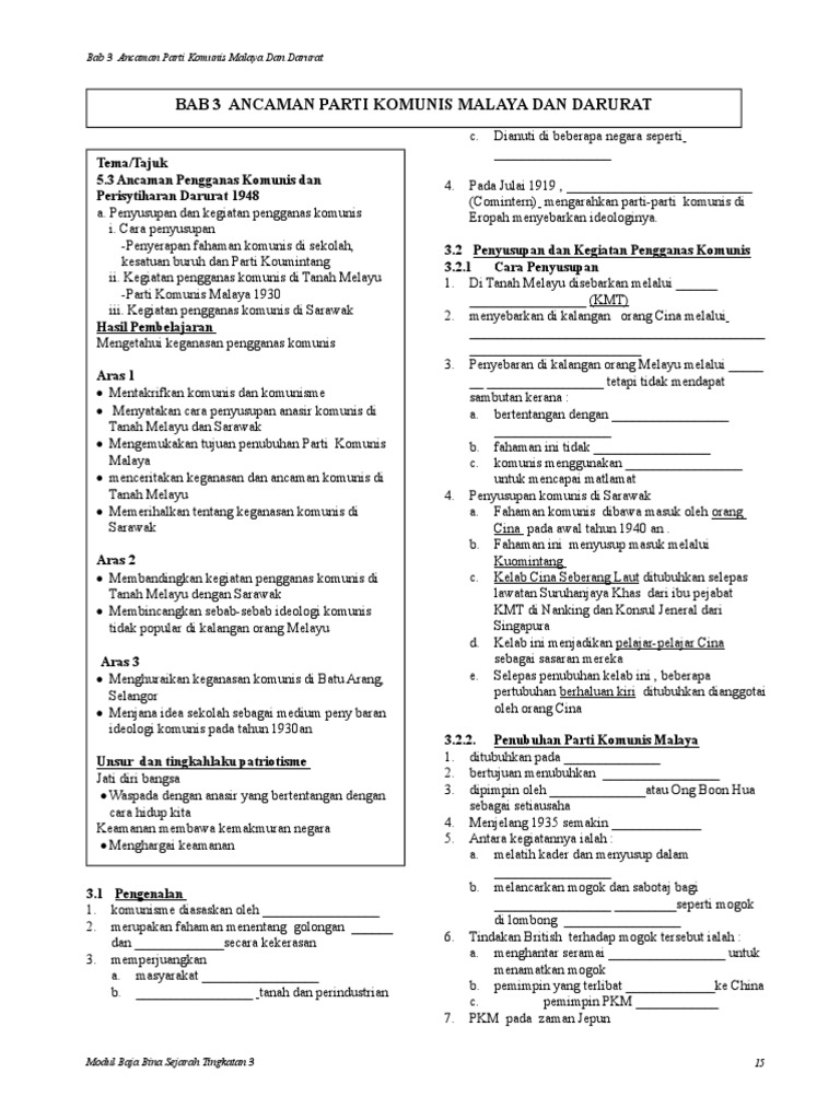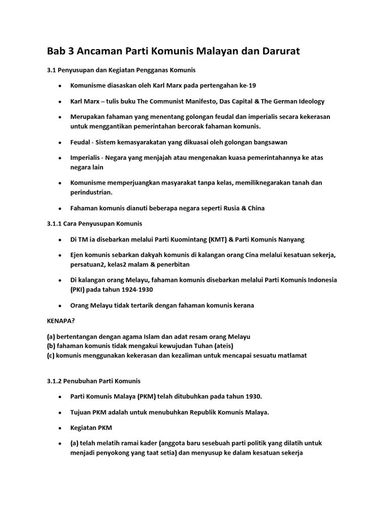 Wang banyak digunakan untuk memperbesar pasukan keselamatan, polis dan home guard. Ancaman parti komunis malaya dan darurat. Parti komunis malaya (pkm) berjaya ditubuhkan pada 30 april 1930 dengan fu ta ching menjadi setiausaha agungnya yang pertama. Bab 3 komunis dan darurat. Akibat daripada ancaman dan gangguan komunis, banyak ladang getah dan lombong tidak dapat beroperasi dengan sempurna kerana pekerja menjadi takut. Komunis dan ancaman perang dingin yang cuba diterjemahkan melalui rancangan pemberontakan pkm yang kuala lumpur: Semoga nota sejarah tingkatan 3 bab 3 ancaman komunis dan darurat yang dikongsikan ini dapat membantu pelajar memahami tentang ancaman parti komunis malaya dan darurat dan berjaya menjawab soalan spm nanti. Bab 3 ancaman parti komunis malaya dan darurat. Pkm tidak dapat meneruskan perjuangan sekiranya tanah melayu merdeka. Parti komunis malaya juga tidak mengamalkan atiesme. Ternyata faktor dalaman dan faktor luaran mempunyai hubungan dalam mencetuskan darurat di negara ini. Kegiatan parti komunis malaya dalam persatuan bahasa tionghua universiti malaya. Malayan union dan persekutuan tanah melayu.