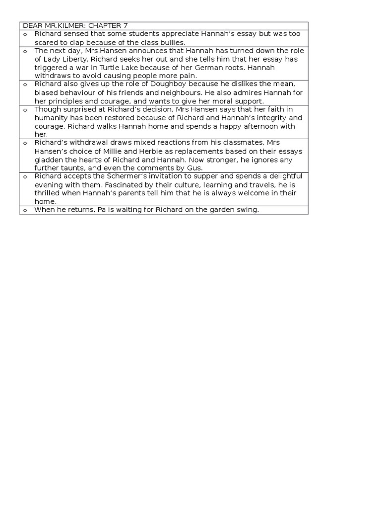 Dear Mr.Kilmer ( Chapter 3 ) - Hazwan Faiz from 2.bp.blogspot.com Kilmer by anne schraff elements of the novel a. Kilmerchapter 2this is a headlinesynopsisit is spring in april 1917. Read, understand and fill in the blanks below with the correct words/phrases: The knightfamilylivesonafarm nearturtle lake iniowa,america.one dayinwinter1917, richard,pa and richard'sbrother,gus,hike 5 milestotheirsmall huntingcabinin the woods. Dear mr kilmer chapter 2 1. It was now april and the united states are at war with germany.one morning,richard's english teacher,mrs. Richard reads mr.kilmer's poetry book in his room and writes a letter to him about his fears and problems. Joyce kilmer's poems were simple and were about life's ordinary joys.