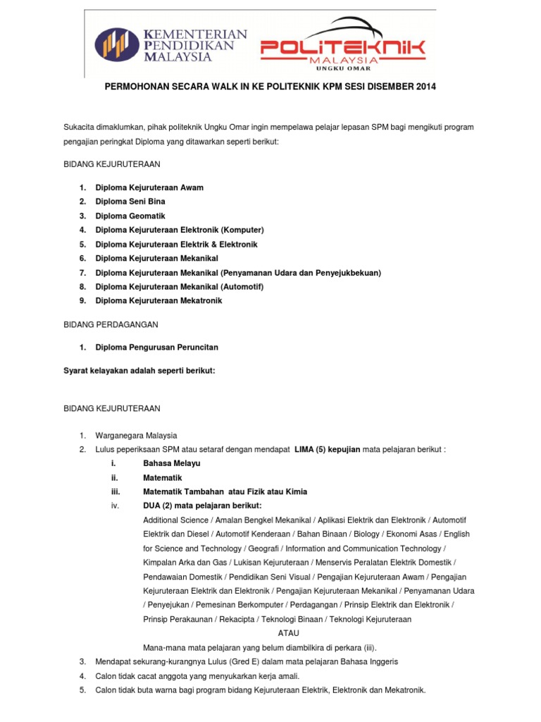 Tawaran Walk In Masuk Ke Politeknik Kpm from imgv2-2-f.scribdassets.com Diploma teknologi kejuruteraan mekanikal rekabentuk. Sijil teknologi kejuruteraan automotif (penyelenggaraan kereta). Institut kemahiran belia negara jitra. Contact diploma teknologi kejuruteraan automotif kktm masjid tanah on messenger. Direkabentuk merangkumi displin kejuruteraan mekanikal dengan pengkhususan bidang automotif dan pembuatan. Diploma memiliki diploma sains atau diploma kejuruteraan dari institusi pendidikan yang diiktiraf oleh universiti dan kerajaan malaysia; #politeknik port dickson created and edited by: Kursus ini juga memberi asas yang luas dalam.