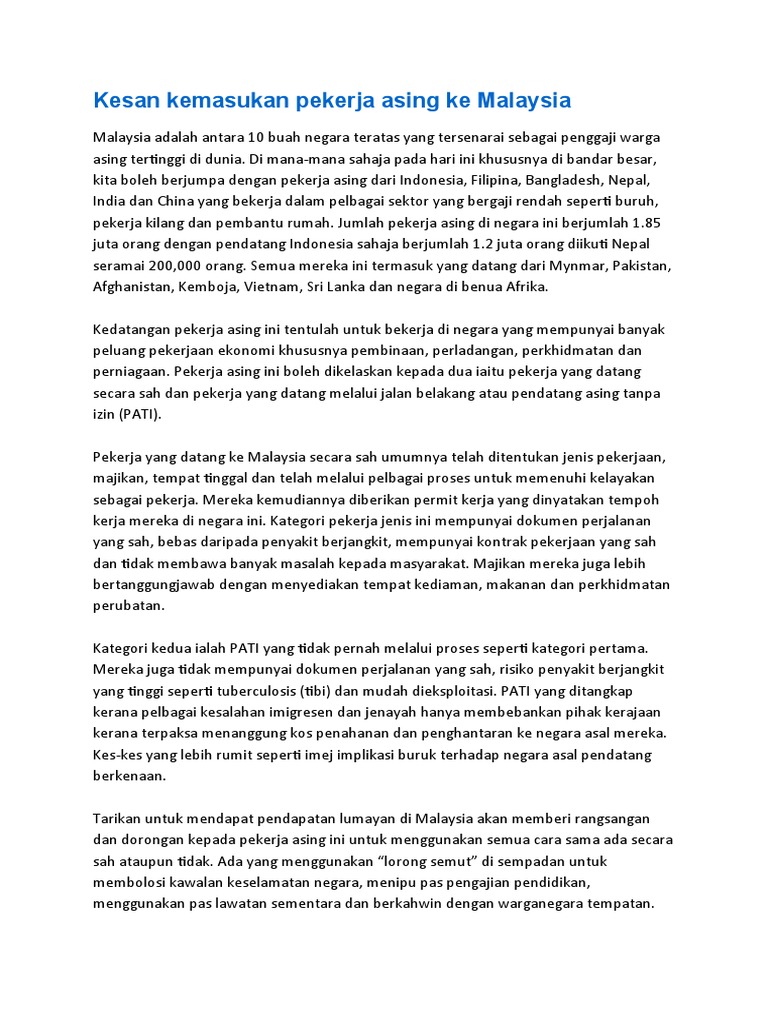 Persepsi masyarakat tempatan terhadap isu kemasukan pekerja asing: Namun membendung kemasukan pekerja asing yang tidak mahu berdaftar adalah cabaran besar kepada kita kerana mereka ini boleh mencetuskan masalah sosial yang lebih parah pada masa hadapan. Pengeluaran wang yang diberikan oleh majikan kepada pekerjanya yang. Pada 6 februari lepas, timbalan. Malaysia adalah antara 10 buah negara teratas yang tersenarai sebagai penggaji warga asing tertinggi di dunia.